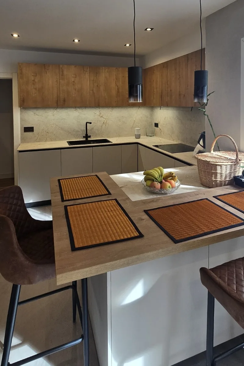 El diseño, realizado por Sonya Contreras, especialista en diseño de cocinas en Valencia, apuesta por una distribución en L con península, lo que permite organizar mejor las zonas de trabajo y generar una zona social muy cómoda dentro de la cocina.