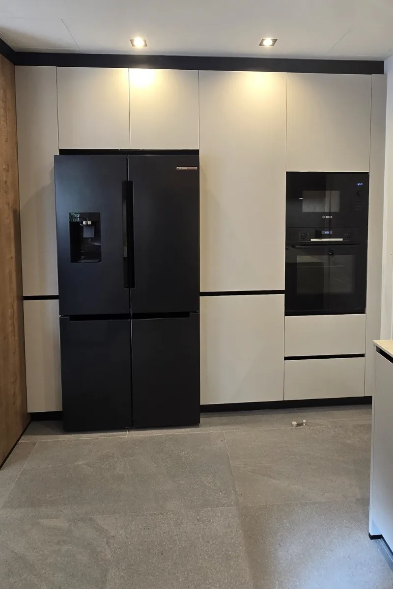 Aquí encontramos el frigorífico americano de 90 cm y la columna de horno y microondas. Las columnas de almacenaje están diseñadas para ofrecer gran capacidad, pudiendo almacenar hasta dos carros de la compra completos en una sola columna.