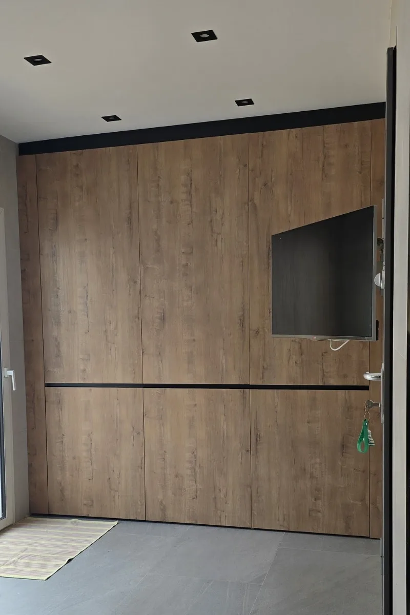 El mobiliario combina frentes en color magnolia con laminado roble. El interior de todos los muebles también está realizado en acabado roble, aportando continuidad estética y una sensación de mayor calidad.