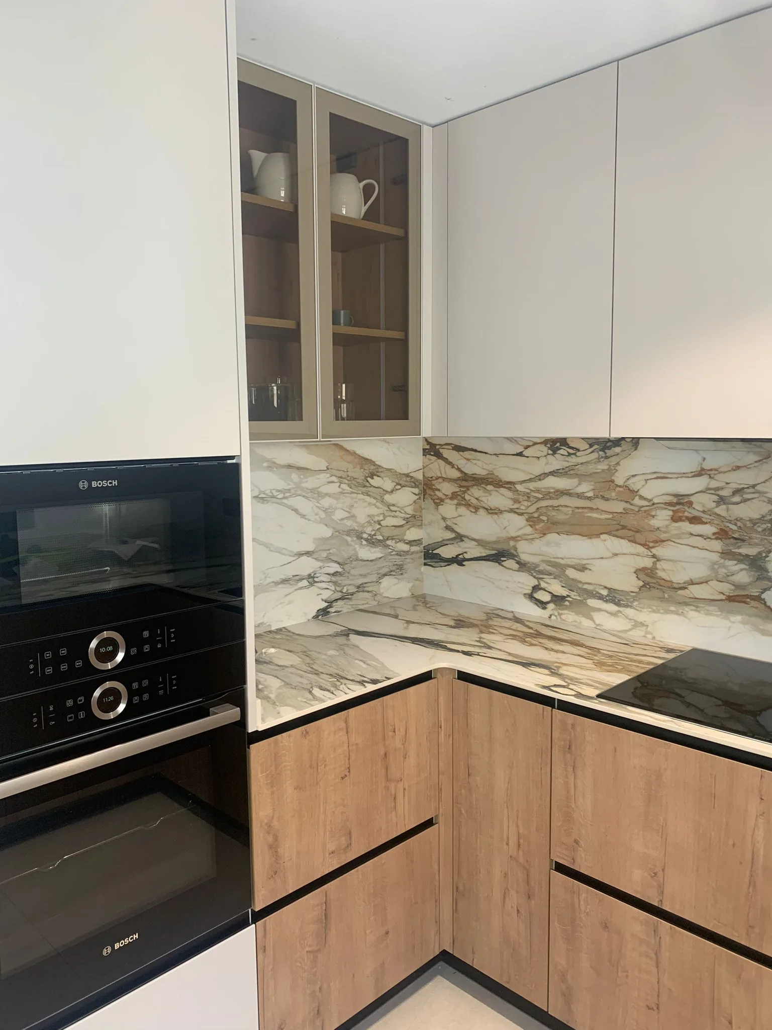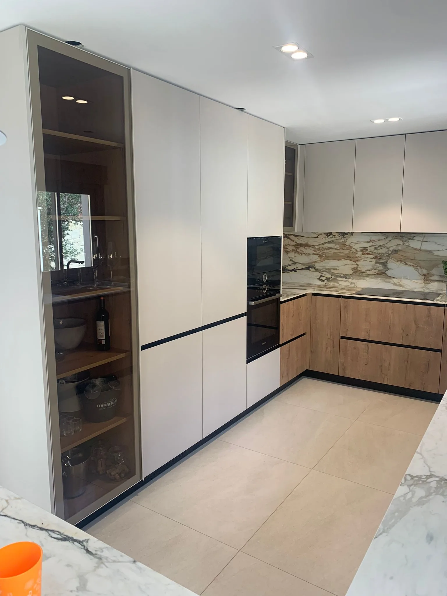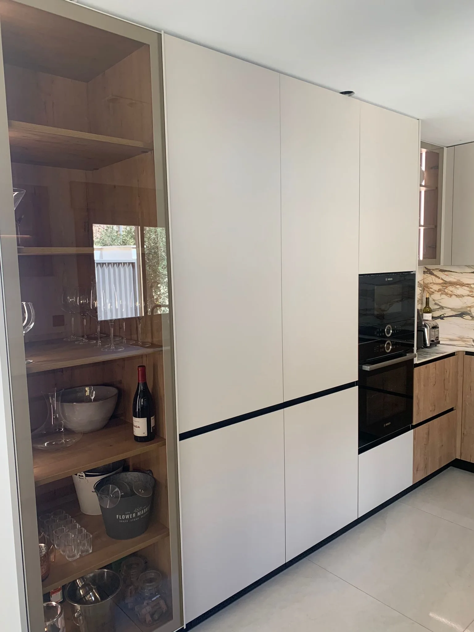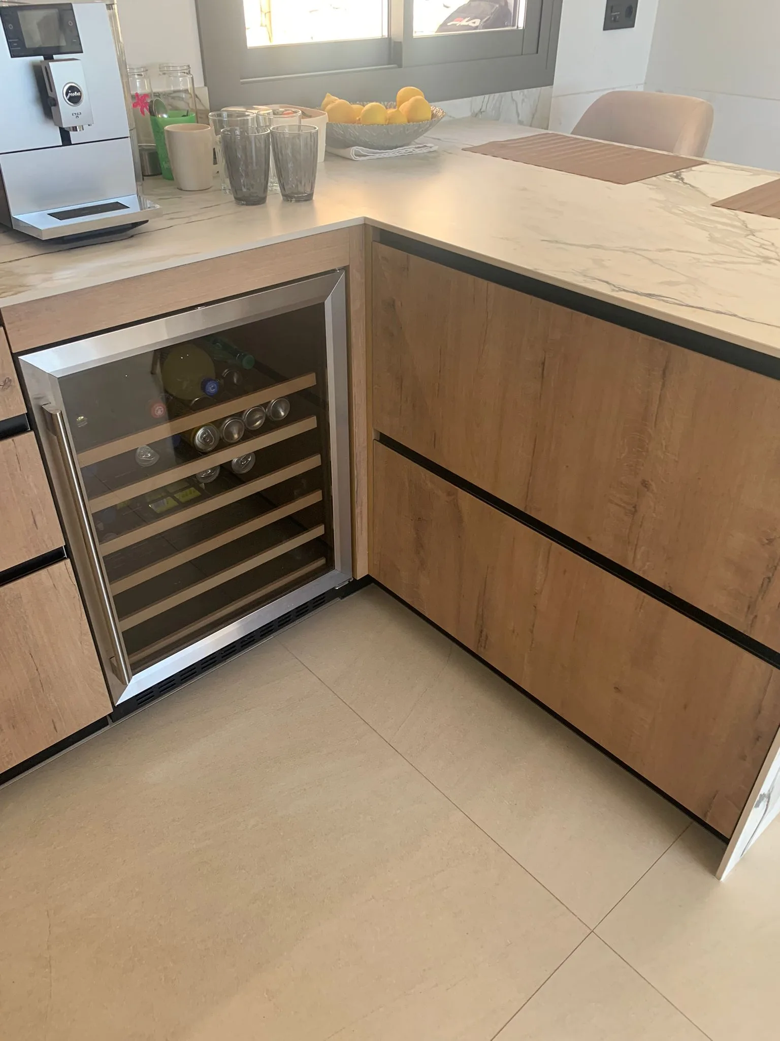 Nevera integrada, vinoteca integrada, columna horno y microondas integrados, campana extractora integrada