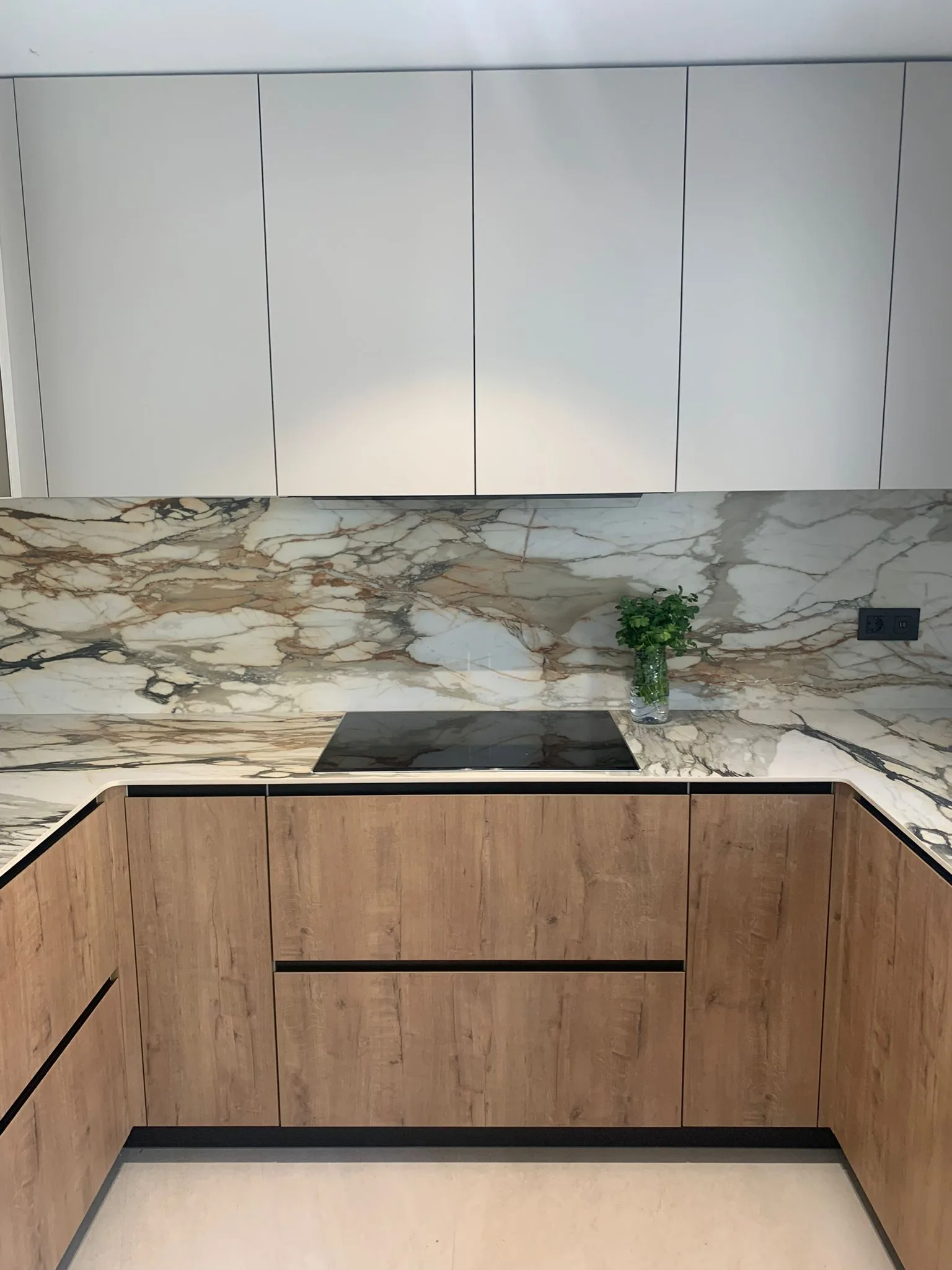Porcelánico con vetas muy marcadas, utilizado tanto en encimera como en el frente de pared hasta la zona de muebles altos