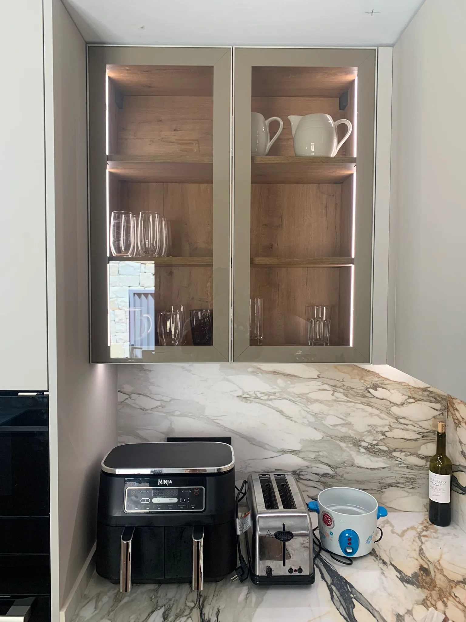 La vitrina aporta ligereza visual y permite crear una transición elegante entre cocina y comedor.