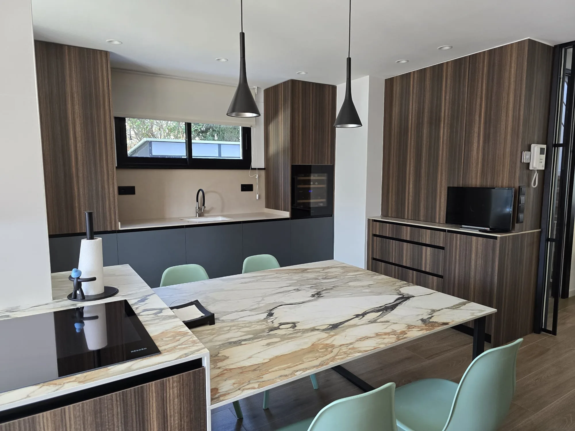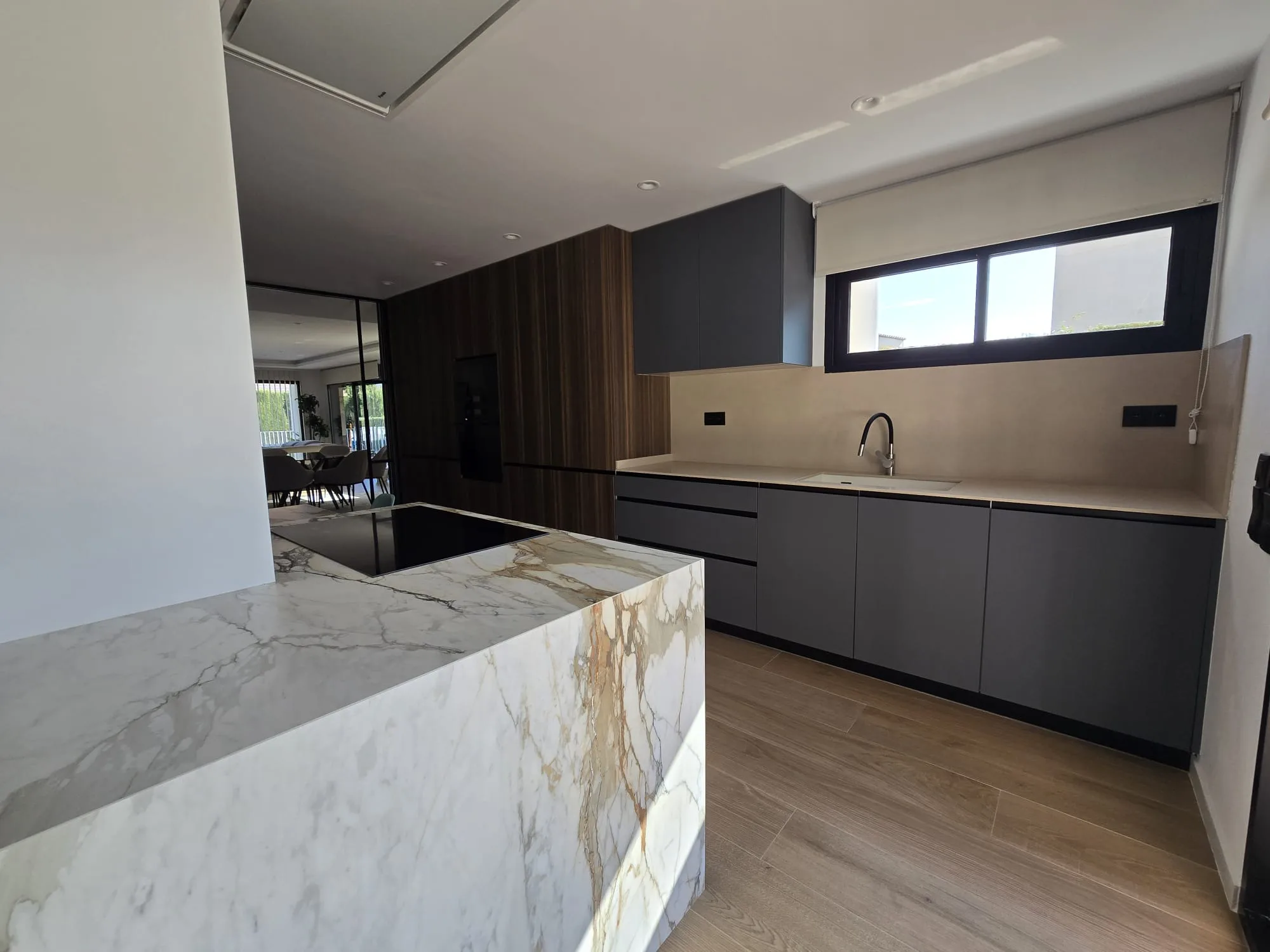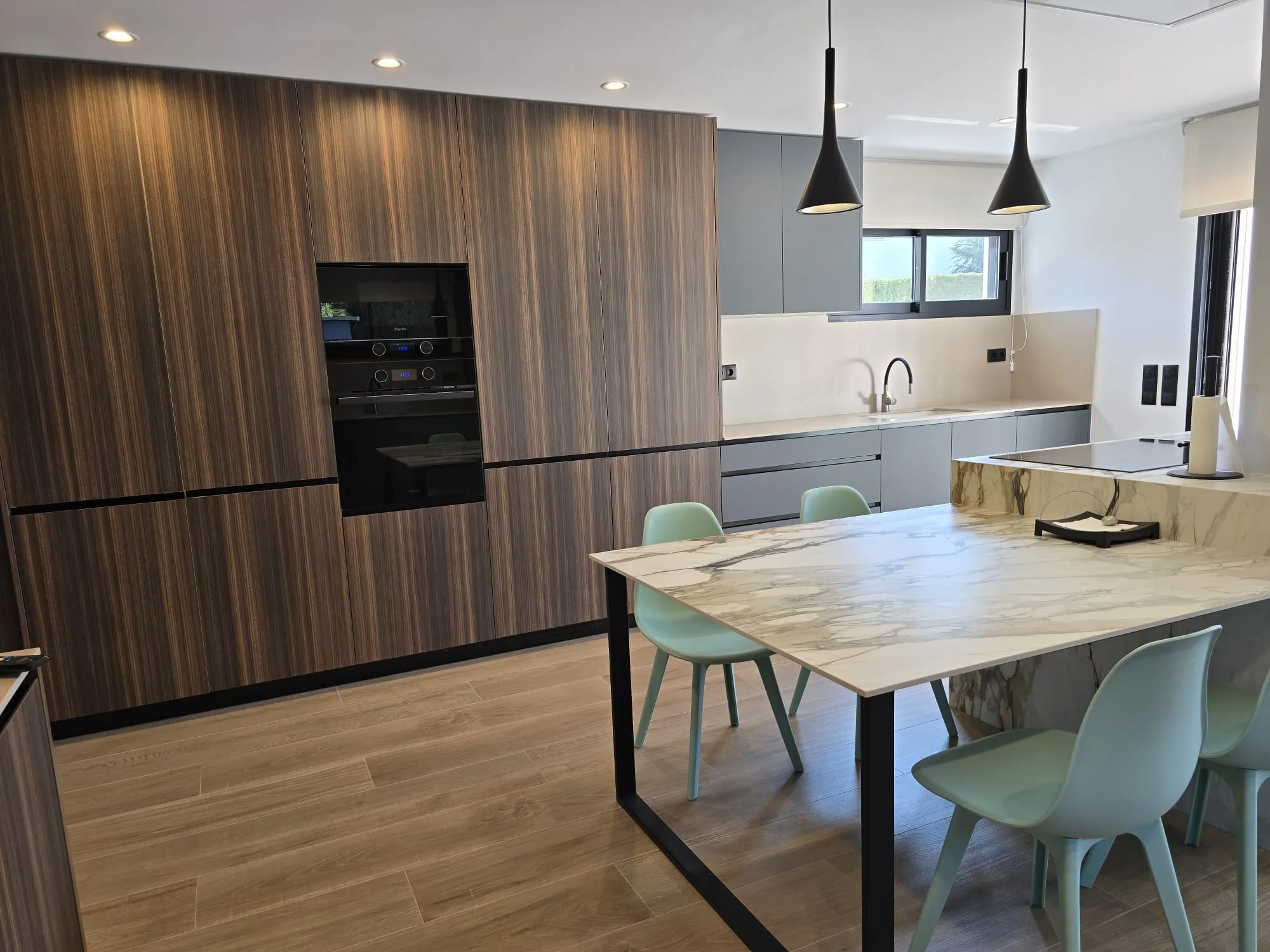 Este proyecto de reforma de cocina en la Urbanización Alfinach (Valencia) nace con el objetivo de crear un espacio elegante y funcional, donde la combinación de materiales naturales y acabados tecnológicos aportan personalidad y sofisticación a la vivienda.