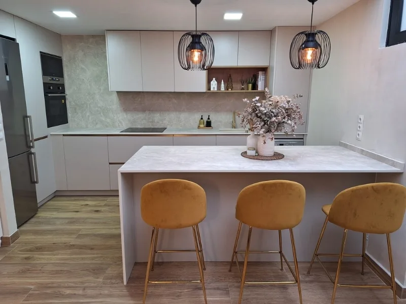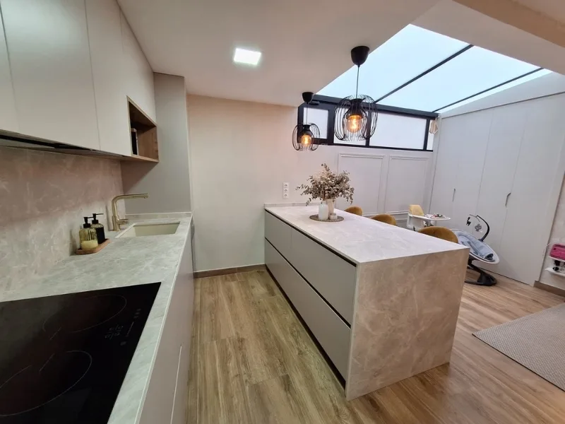 Cocina de tonos neutro efecto cementado